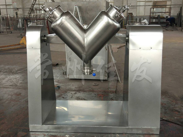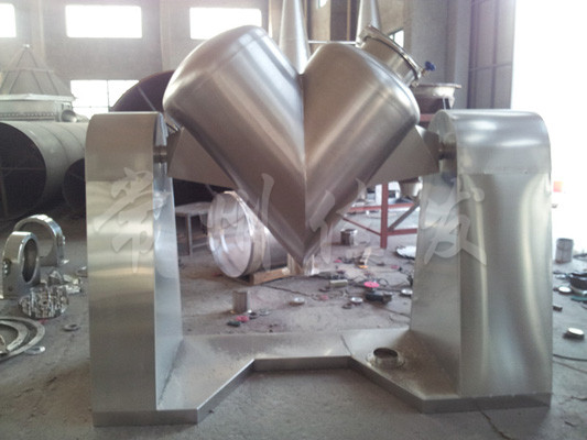 該機通過機械傳動,使不對稱的V型圓柱體內(nèi)的物料做往復(fù)翻動,達(dá)到均勻混合之目的。