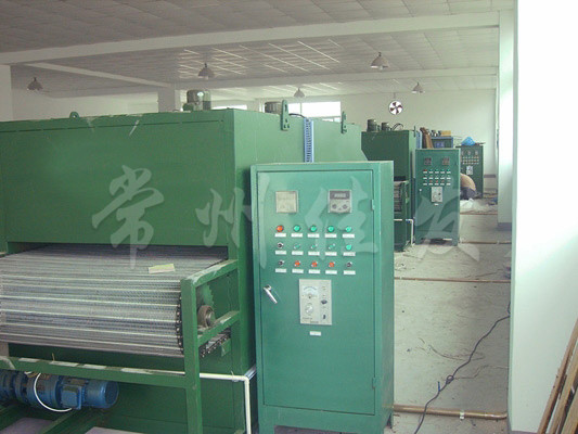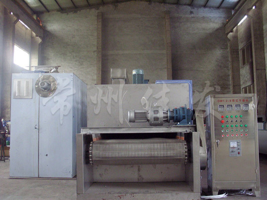 物料由加料器均勻地鋪在網(wǎng)帶上,網(wǎng)帶一般采用12-60目不銹鋼絲網(wǎng),由傳動裝置拖動在干燥機(jī)內(nèi)移動。干燥機(jī)由若干單元組成,每一單元熱風(fēng)獨立循環(huán),部分尾氣由專門濕風(fēng)機(jī)排出,廢氣由調(diào)節(jié)閥控制,熱氣由下往上或由上往下穿過鋪滿物料的網(wǎng)帶完成熱量與質(zhì)量傳遞的進(jìn)程,帶走物料的水份。網(wǎng)帶緩慢移動,運行速度可根據(jù)物料溫度自動調(diào)節(jié),干燥后的成品連續(xù)落入收料器中。上下循環(huán)單元根據(jù)用戶需要可靈活配備,單元數(shù)量亦可根據(jù)需要選取。